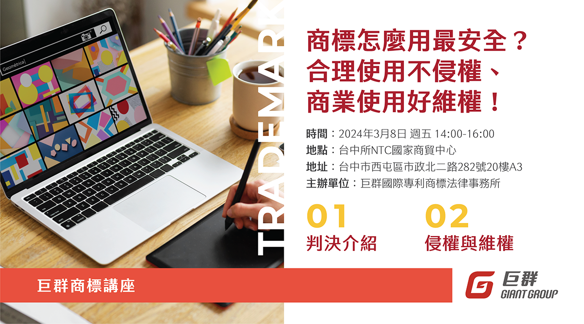 創業維艱,想破了頭才定案的企業形象代表,熟料一推出市場即收到商標侵權律師函,更名、撤除招牌、下架電商平台…不是老天開了個玩笑,而是學校沒有教的事,怎麼有效推廣商業業務避免侵權風險,歡迎來聽聽與眾不同的實務分享;好不容易取得商標權利,市場上拚鬥了許多年,老天又送來一個商標撤銷通知,才發現商業使用的圖樣與註冊態樣不同,權利維護比申請註冊更重要,如何真實使用堆砌企業形象避免撤銷風險,趕快準備問題,講師用心解答您心中的困擾,讓您開春火紅一整年。